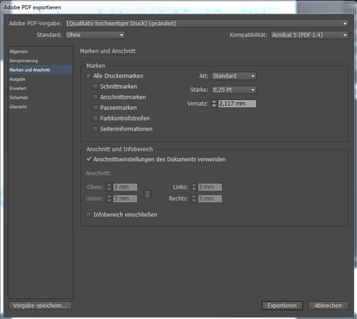 Trimming (for PDF Export): In the PDF export field under "Marks and Bleeds" please use the "Use interface settings of the document", checkbox if you have previously defined the trimming in the document.