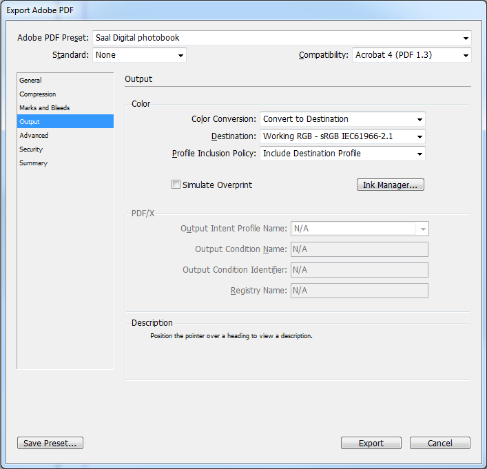 PDF Export (recommended when using InDesign and QuarkXPress): We always recommend using "High-quality printing" when exporting PDF files, or use our Adobe PDF Saal Digital. In "Output" please change the target color space to RGB-Color Space - sRGB IEC61966-2.1 (see screenshot below). If you use the „Double Pages“ funtion (for photobooks) with a layout program such as QuarkXPress or InDesign, please ensure that you have set the „Print Sheets“ (QuarkXPress = Moutning Surfaces) checkbox. It is important that we receive every double page as a page in the PDF.